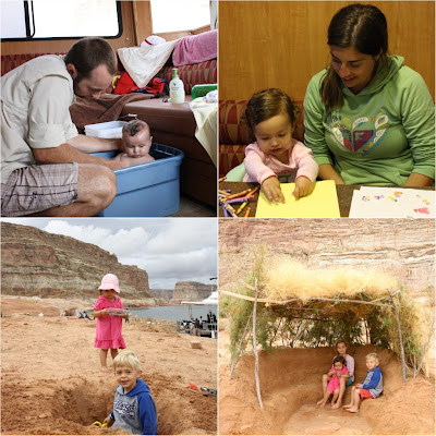 All last week we were House-boating on Lake Powell with wonderful friends. It was 7 days on the water and a full day to get there and back. Thankfully the kids did really well on the 11 hour car drive. We planned it that we started out during nap time, then they were awake for a while, then both ways we stopped for dinner in Vegas and to burn off energy and stretch our legs for a bit, before hitting the road again, while the kids slept the remaining 5 or so hours. They are both excellent in the car, with little to no crying from either of them, both ways!! This was my first time house-boating, and it was so much fun, and so beautiful! The landscape is gorgeous, with stunning rock formations, and the water was a perfect temperature, in the mid-high seventies. Our plan was to find the perfect beach and anchor the boat, then take off on the motor boats and jet skis to explore and wake board. We found a good beach the first day, but then the second day an even better one became available, so we moved the boat one last time, and enjoyed our rad beach for the week. It was clean and sandy, with great coves and hiking all around. We settled in to boating, wake boarding, hiking, swimming, jet-skiing, eating delicious food, and hanging out. Clara loves having older kids to tag around with, she was so independent and big-kid like the whole trip! She really looks up to Kelly & Nolan's kids, Brenna and Brett, and they were so good with her. Of course Clara absolutely loves Matt & Jeannine, and can't get enough of them. Luckily Matt & Jeannine are fond of our kids as well, because we all six slept in very tight quarters. We had the lower room that had two full size beds, and just enough floor space for a pack n play and travel bassinet. Somehow by early morning we would all four end up in the small bed, and I don't think anyone was sleeping very well. Oh well, it was worth it!